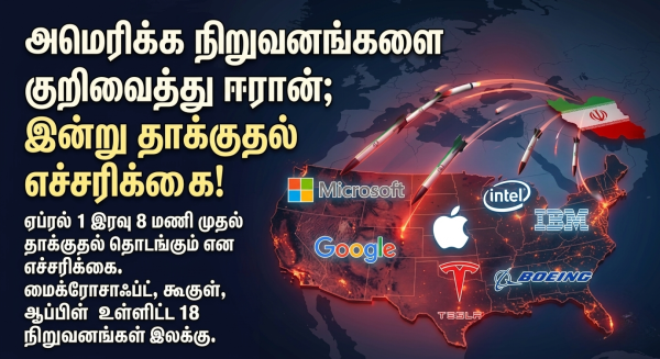 ஈரான் புரட்சிகரப் பாதுகாப்பு படைகள், அமெரிக்காவில் இயங்கும் முக்கிய தொழில்நுட்ப மற்றும் தொழில்துறை நிறுவனங்களை குறிவைத்து ஏப்ரல் 1ஆம் திகதி தாக்குதல் நடத்த வாய்ப்பு உள்ளதாக எச்சரிக்கை விடுத்துள்ளது. இந்த மிரட்டல் அறிவிப்பில், தாக்குதல்கள் ஈரானிய நேரப்படி ஏப்ரல் 1ஆம் திகதி இரவு 8 மணியிலிருந்து தொடங்கும் என குறிப்பிடப்பட்டுள்ளது.