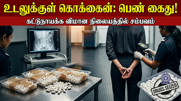 கொக்கைன் போதைப்பொருளை தனது உடலில் மறைத்துக்கொண்டு இலங்கைக்கு வந்த வெளிநாட்டு பயணி ஒருவர் ஞாயிற்றுக்கிழமை (12) காலை 09.30 மணியளவில் கட்டுநாயக்க விமான நிலையத்தில் சுங்கப் போதைப்பொருள் ஒழிப்பு பிரிவினரால் கைது செய்யப்பட்டார். கைது செய்யப்பட்டவர் உகண்டா நாட்டைச் சேர்ந்த 47 வயதுடைய பெண் வர்த்தகர் என தெரிவிக்கப்படுகிறது.