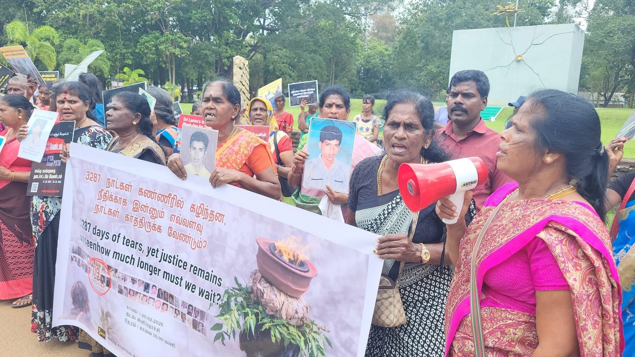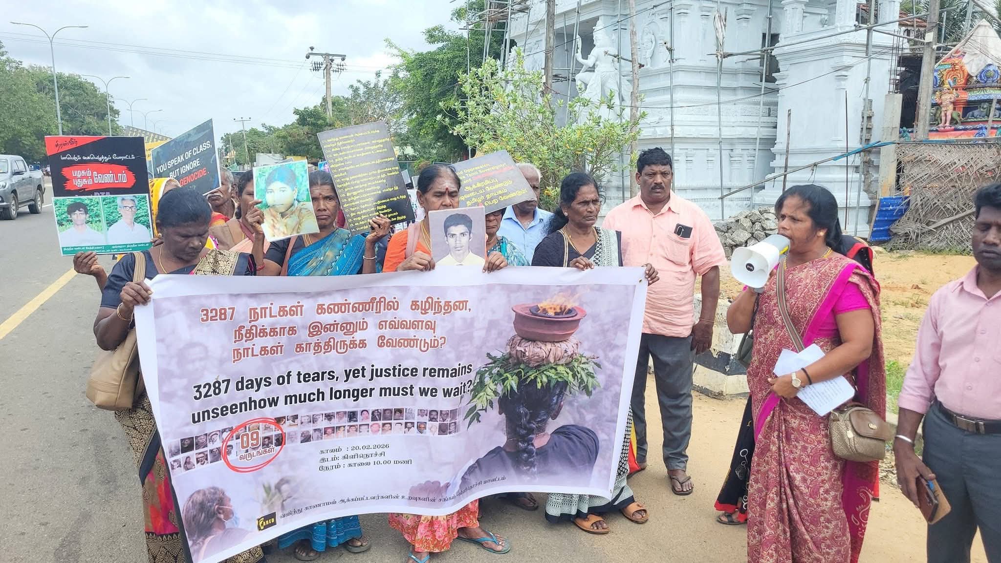 இந்த நிலையில், நீதியை வலியுறுத்தி கவனயீர்ப்பு போராட்டம் இன்று கிளிநொச்சியில் முன்னெடுக்கப்பட்டது. போராட்டத்தில் கலந்து கொண்ட உறவினர்கள், காணாமல் ஆக்கப்பட்ட தமது குடும்பத்தினரின் புகைப்படங்களை ஏந்தியபடி உண்மை மற்றும் நீதி கோரி கோஷமிட்டனர்.