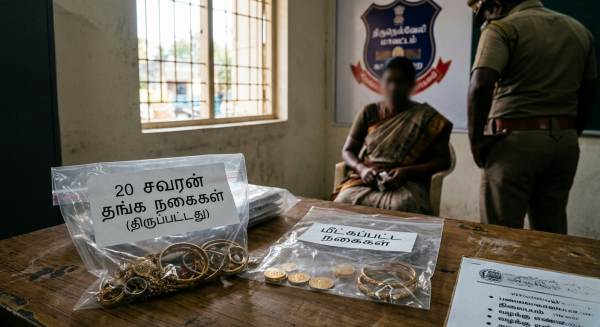 நாகராஜன் என்பவரின் மனைவி ஜெனிட்டா (58), சம்பவம் நடந்த நாளில் வெளியில் சென்று வீடு திரும்பிய பின்னர், தன்னுடைய 20 சவரன் தங்க நகைகளை கழற்றி மேசையில் வைத்து விட்டு ஓய்வெடுத்துள்ளார்.