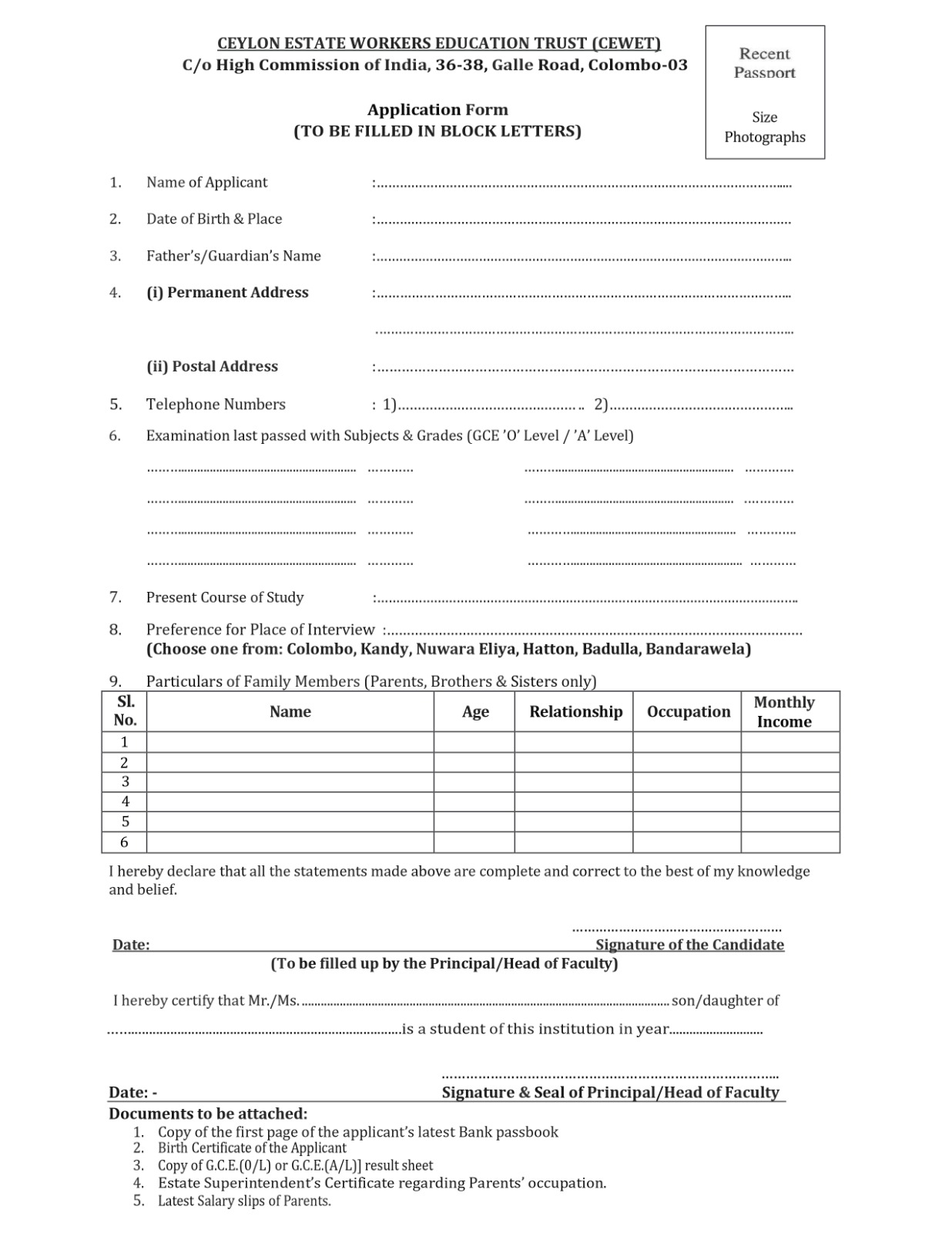குறைந்தது 6 திறமைச் சித்திகளுடன் க.பொ.த சாதாரண தரத்தில் தேர்ச்சி பெற்றோரும் அல்லது உயர்தரத்தில் தேர்ச்சி பெற்ற 25 வயதிற்குட்பட்ட மாணவர்களும் விண்ணப்பிக்க தகுதியானவர்கள். விண்ணப்பத்துடன் பிறப்புச் சான்றிதழ், பரீட்சை பெறுபேறுகள், பெற்றோரின் சம்பள விபரம், தோட்ட அத்தியட்சகர் சான்று மற்றும் வங்கி கணக்கு விவரங்கள் உள்ளிட்ட ஆவணங்கள் இணைக்கப்பட வேண்டும். விண்ணப்பப் படிவங்கள் இந்திய உயர் ஸ்தானிகராலயத்தின் இணையதளம் அல்லது கொழும்பு மற்றும் கண்டி அலுவலகங்களில் பெற முடியும்.