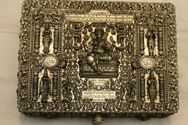 இதன் மதிப்பு சுமார் ரூ.25 லட்சம். ஆச்சரியமான விஷயம் என்னவென்றால், இந்த முழு அழைப்பிதழும் 128 விதமான வெள்ளித் துண்டுகளால் ஆனது, அதை இணைக்க எந்த ஆணிகளோ அல்லது திருகுகளோ பயன்படுத்தப்படவில்லை. 3 கிலோ வெள்ளியால் உருவாக்கப்பட்ட இந்த அழைப்பிதழ் ஆபரணங்கள் வைக்கும் பெட்டியைப் போல வடிவமைக்கப்பட்டுள்ளன.